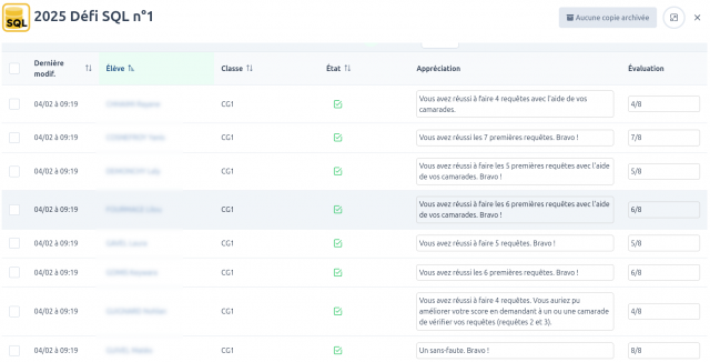 Les défis SQL sont basés sur la coopération entre étudiants : la classe doit réaliser collectivement un nombre défini de requêtes SQL en 45 minutes. Lors du premier défi, le nombre de requêtes était de 5 x nombre d’étudiants présents (13) soit 65 requêtes. Pour le deuxième défi et ceux qui suivront, la classe doit battre son record précédent. Lorsque l’objectif est atteint tous les étudiants bénéficient d’un point bonus sur le prochain devoir. Si l’objectif est atteint à 90 %, ils obtiennent un demi point.