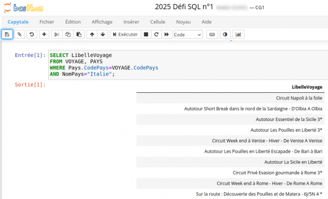 Pour réaliser les défis SQL, les étudiants utilisent le service en ligne Capytale, disponible dans tous les ENT, qui permet notamment de réaliser des requêtes SQL dans des notebooks. Ainsi, chaque étudiant a la possibilité de modifier une requête jusqu’à obtenir un résultat cohérent.
